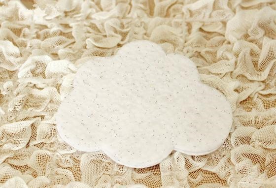 第二步:把白色不织布剪裁出两个云朵形状。再用热胶把它的边缘粘紧(注意:留一个开口)