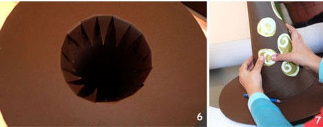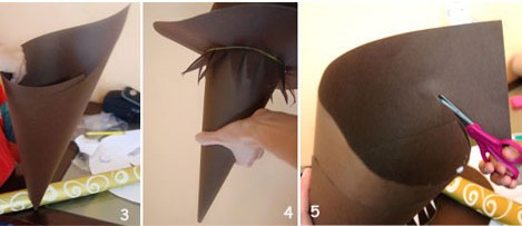第二步:另外拿出一张棕色卡纸,将其卷成喇叭状,并将多余的纸减掉,让下方的边要保持平整,并且将其固定好。