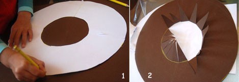 第一步:首先在大张的棕色卡纸上裁出一个大圆,然后在大圆的正中间裁出一个小圆,但注意这个圆要从中间裁成多块三角形,并将其散开,不要与大圆分离,如图。