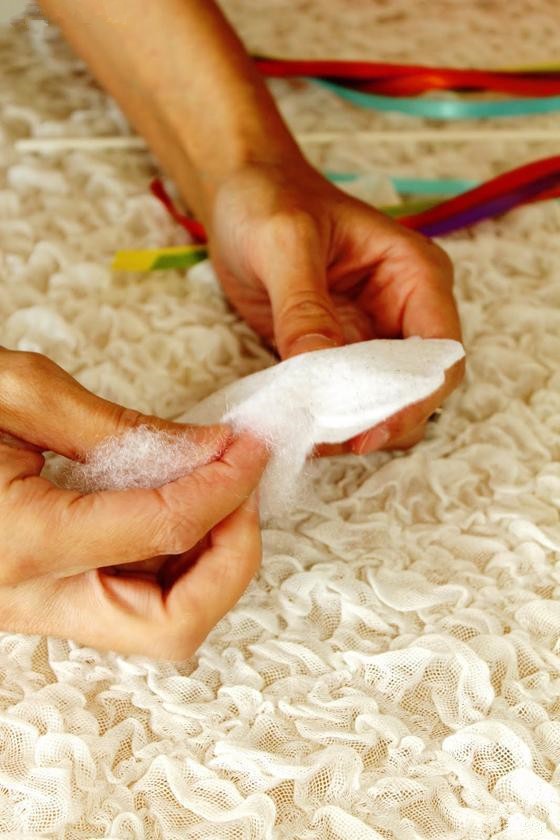 第三步:从开口处往云朵里面塞入棉花,再用热胶封口。