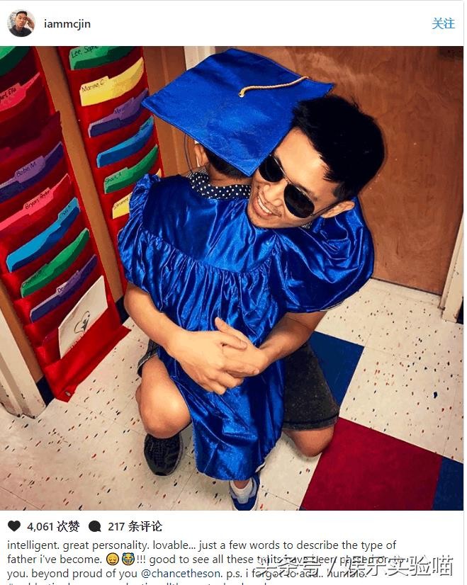 儿子幼儿园毕业,与MC Jin来个温馨拥抱!其实MC Jin之所以蒙面参加《中国有嘻哈》,也是因为儿子!儿子Chance一直视他为偶像,其他同学都喜欢蜘蛛侠,蝙蝠侠,但机会心目中最喜欢的是爸爸,是儿子心目中的“嘻哈侠”!有这么暖心的儿子,令MC Jin不希望一开始参赛便被大家知道他是谁,而是以嘻哈侠的身份参加。