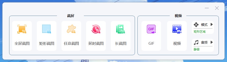 我们打开之后可以看到有两个区域:截屏和视频。在视频区域【模式】中可以设置录制的模式,分为全屏和矩形区域,在【音频】中可以设置声音,设置好之后点击【视频】就可以开始录制了。