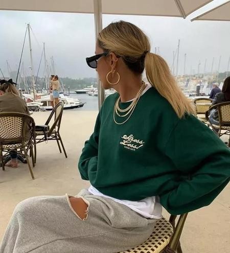 对于普通人来说,最简单的方式,是保持常见的卫衣款式,加上配饰和颜色变化就增加时尚感。例如小圆领的圆润廓形卫衣,叠搭金属配饰,就显得酷感也有腔调。