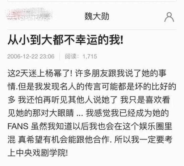 随后,有网友发现魏大勋其实早就是杨幂的迷弟了,魏大勋2006年在博客曾写道:“这2天迷上杨幂了,我只是喜欢看她的那对大眼睛,真希望有机会能和她合作。”多年后,魏大勋和杨幂真的合录综艺节目,如今两人又被曝出恋情,网友们纷纷表示这是追星成功的新典范。