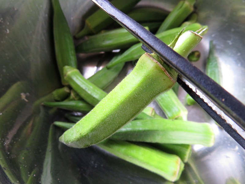 1、秋葵用剪刀将蒂剪去,将棱也要剪去,但是不要剪到肉哦,不然会使脏水流入秋葵里