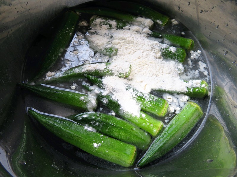 秋葵300克,粗盐1勺,面粉半量杯