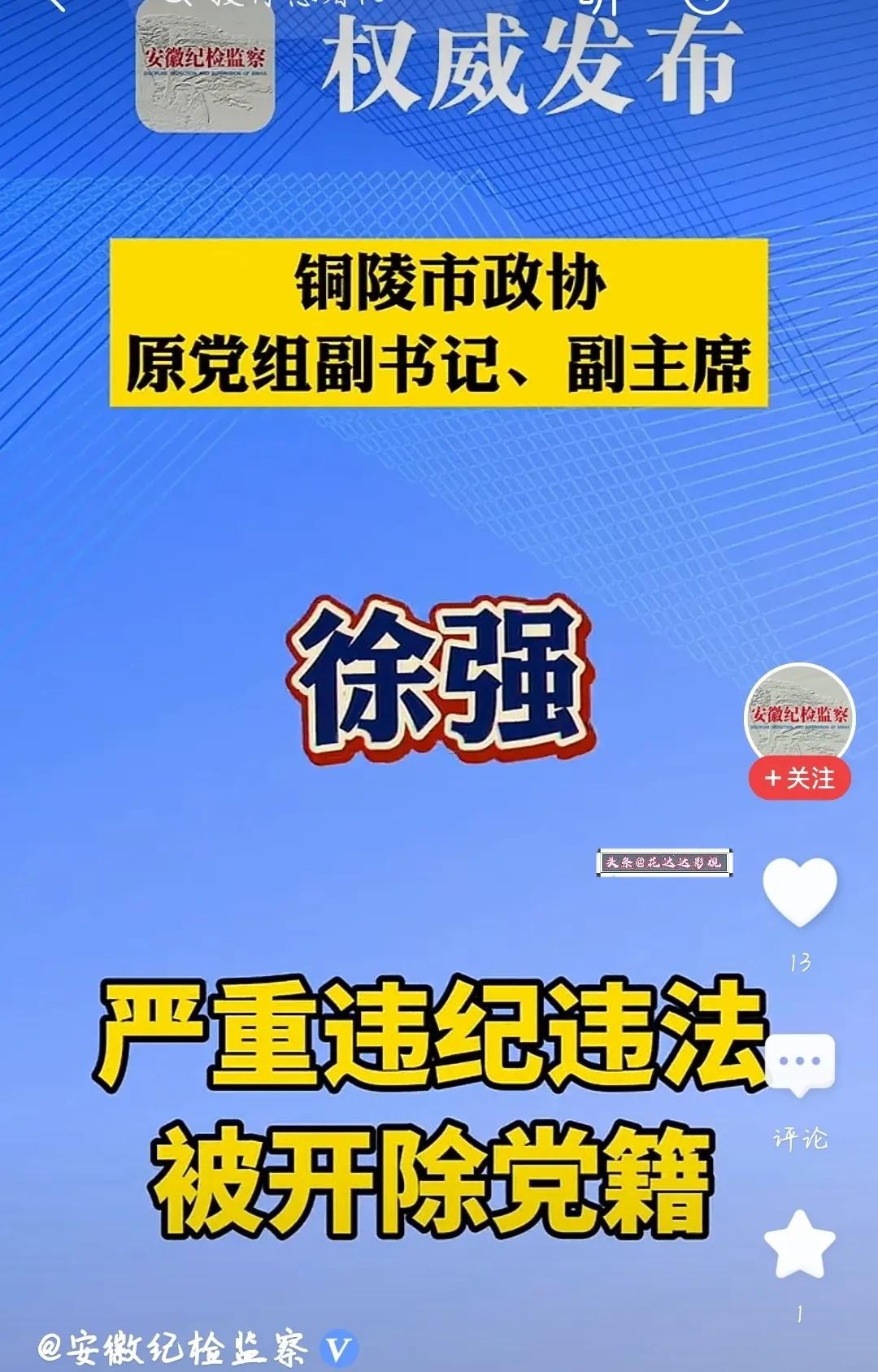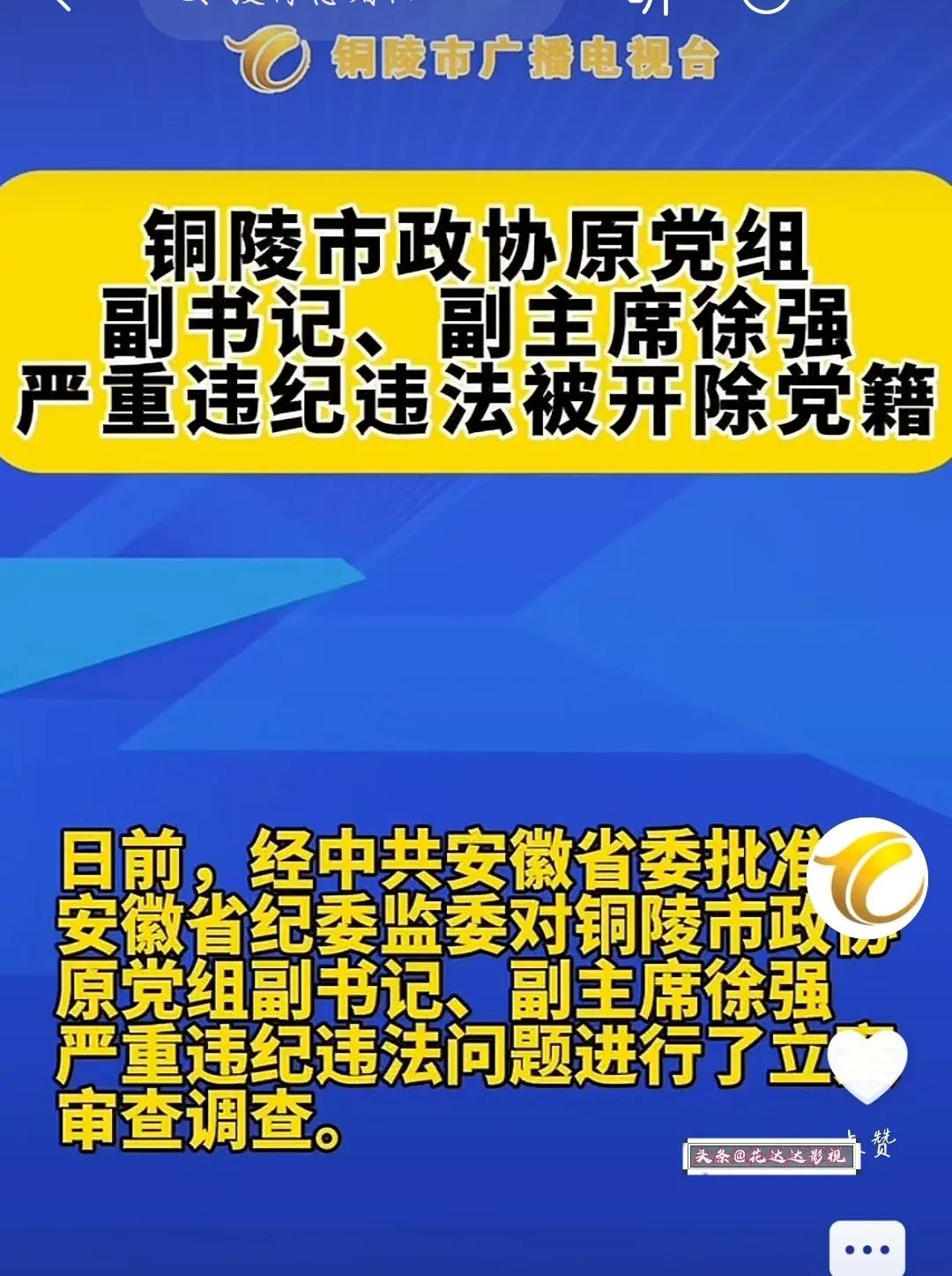 安徽省铜陵市政协原党组副书记、副主席徐强因严重违纪违法,近日已被开除党籍,此消息迅速引起社会广泛关注。