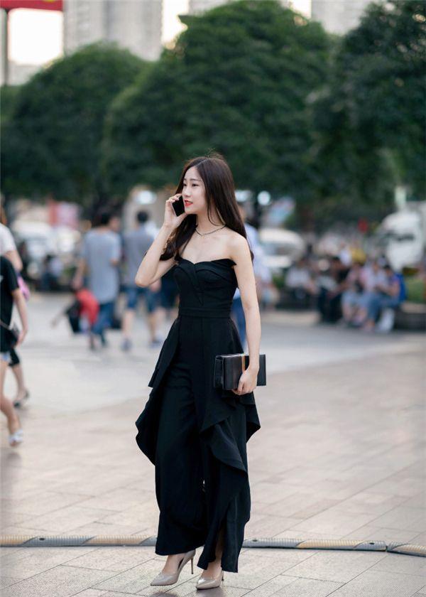 街拍:美女穿搭黑色连衣裙,香肩外露 ,让人心动不已。