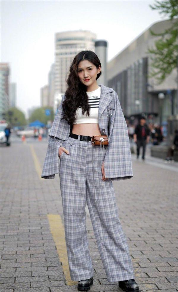 街拍:露肚脐上衣+西装套装,小姐姐的气场好强啊。