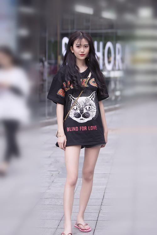 街拍:略带凌乱的头发,搭配拖鞋,显得特别随性,长T恤搭配短裤又显得腿很细长,给人一种休闲又时尚的感觉。