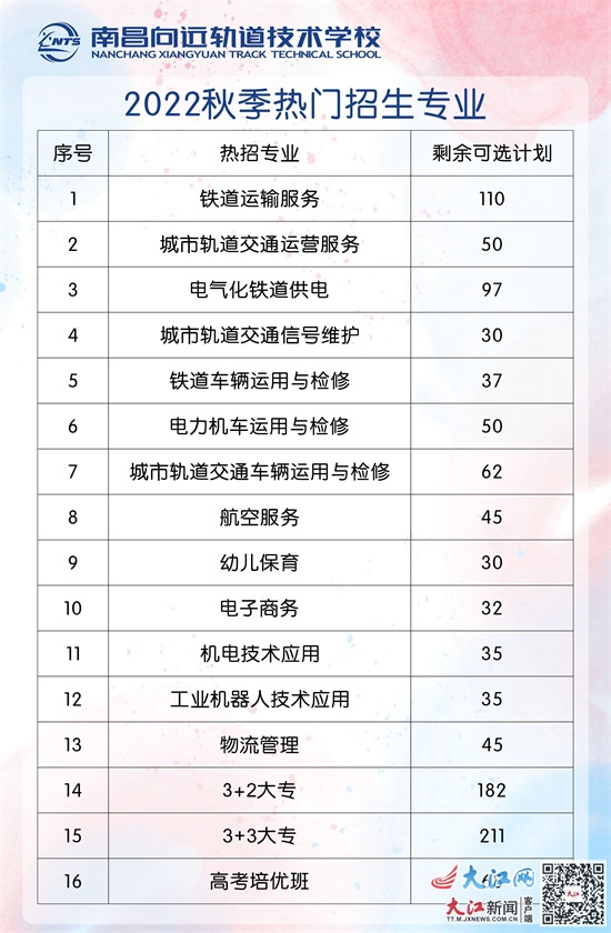 为此,南昌向远轨道技术学校设置了高考培优班,专业有城市轨道交通运营服务、幼儿保育、电子商务、铁道车辆运用与检修,学制为“3+3”大专或“3+4”本科。