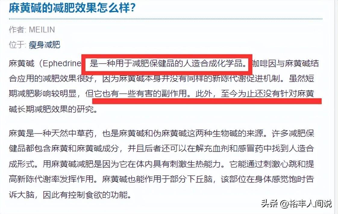 据了解,“麻黄碱”是一种用于减肥保健品的人造合成化学品。虽然短期减肥影响比较明显,但它有一些有害的副作用,所以并没有被广泛利用。
