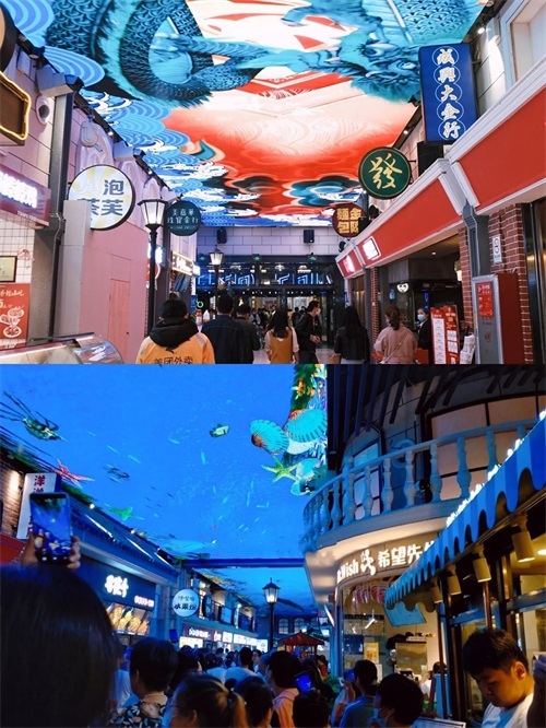 在这条街,一天能尽享春夏秋冬❄,3D天幕上还营造出海洋、巨龙、烟花、雪花❄等景色效果!吸引了很多人前来拍照打卡