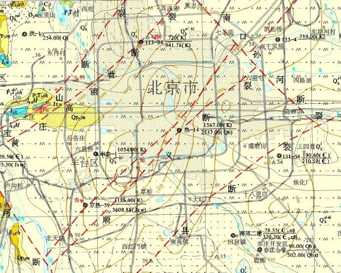 北京城区地质图(红色断线为断层) 图片来源于网络