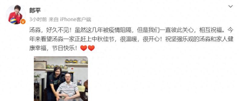 郎平在社媒上发文,她回国之后专门去看望昔日男排运动员汤淼,而后者已经瘫痪16年。