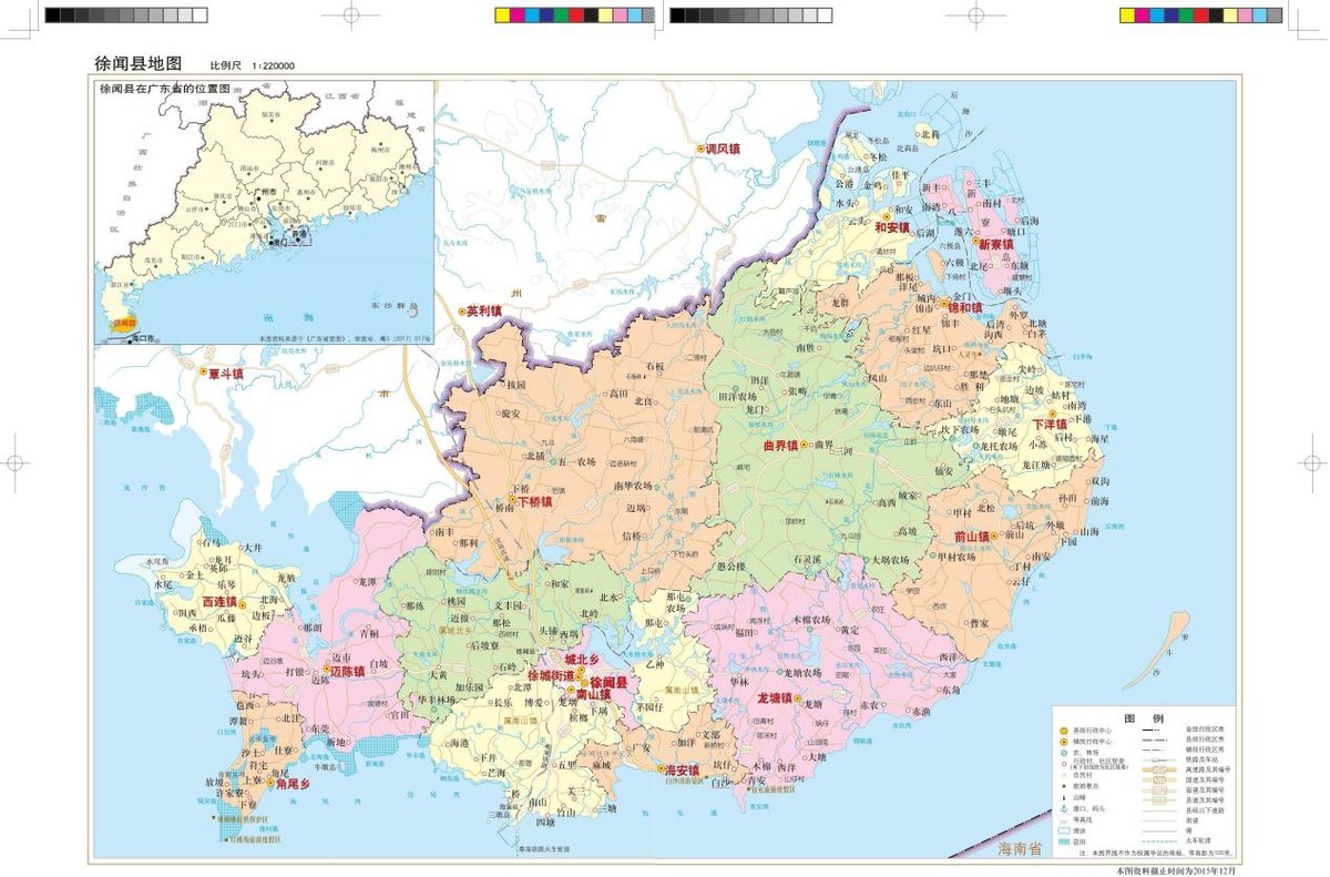 2015年末,全县设12个镇(南山、下桥、海安、龙塘、前山、曲界、锦和、下洋、和安、新寮、迈陈、西连),2个乡(城北、角尾),1个街道办事处(徐城),1个省级经济开发区(徐闻),辖村委会173个,居委会25个,1261个自然村,1375个村民小组。县内有农垦场4个(南华、五一、红星、友好)、农垦集团公司1个(华海,由勇士、海鸥农场组建),橡胶研究所1个(徐闻),国营防护林场1个(湛江市),国营盐场1个(徐闻),县属农场1个(大水桥),珊瑚礁国家级自然保护区1个(徐闻)。行政区域面积1979.6平方千米。徐闻县简称“徐”。县人民政府驻徐城街道,位于德新一路县人民政府大院。