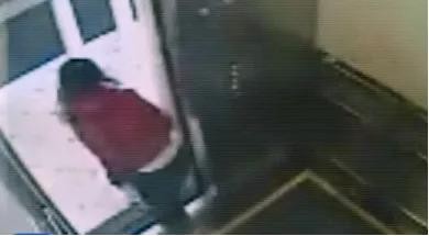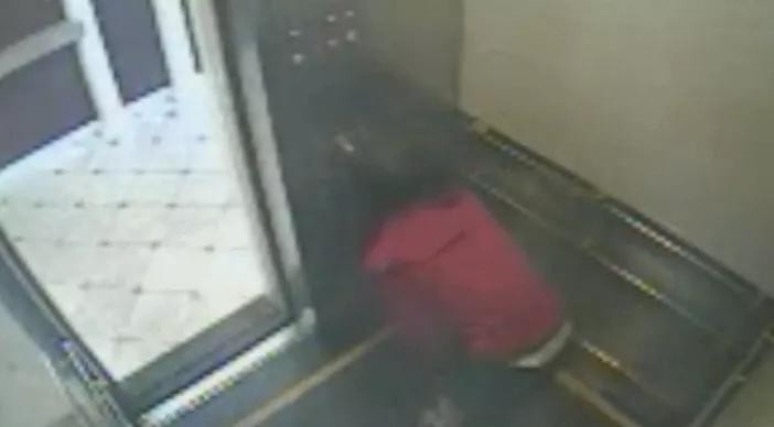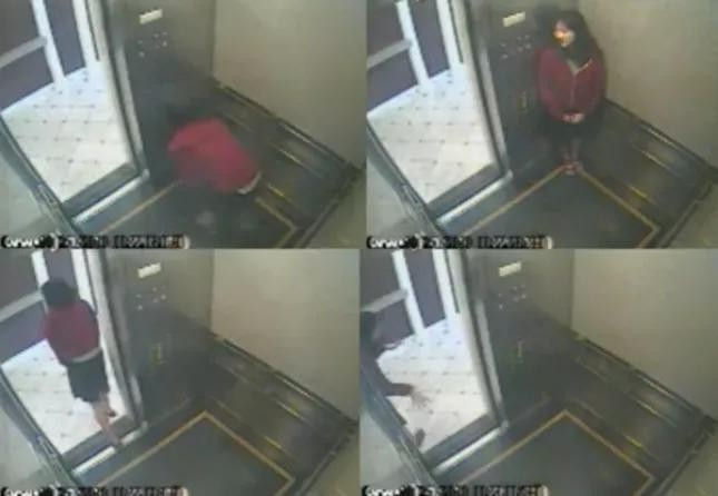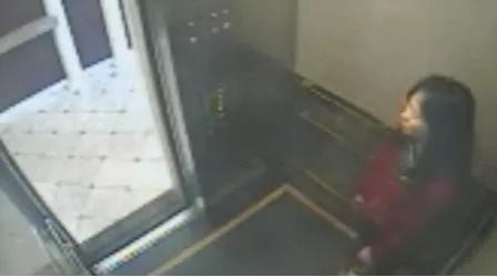 视频中,身穿红色外套的华裔女子反复进出电梯,她神情紧张动作诡异,好像在躲避什么人。