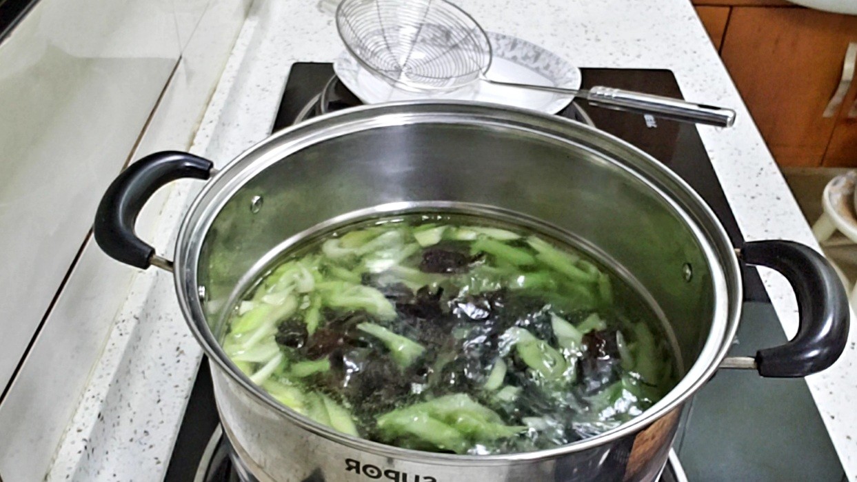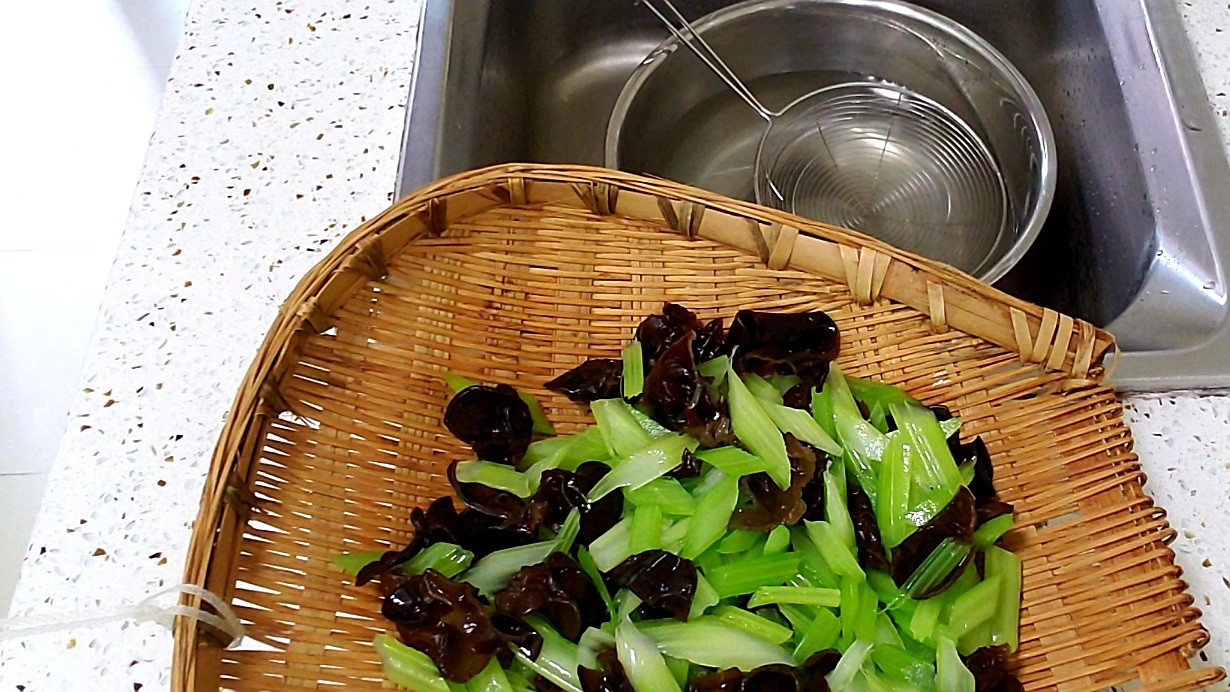 第四、把焯水的芹菜、木耳捞出置于竹筐里冷却。一方面,可以迅速冷却焯水后的芹菜、木耳,使其更加脆嫩和增色;另一方面,有利于芹菜、木耳较好地锁住水分,确保其营养成分不流失。朋友们值得注意的是:芹菜木耳炒制鸡蛋前,木耳在春夏季不需要用冷水浸泡,热水断生即可,焯水的时间也要把握好,可根据芹菜、木耳的多少而定,一般2分钟足矣。若煮得过久,会致使芹菜、木耳变得过软,从而导致汁液流出,营养损失。秋冬季做芹菜、木耳炒鸡蛋时,木耳焯水前用冷水浸泡20分钟,焯水后用凉水过一下,这样芹菜、木耳才不会变色和清脆,以 利于更好地锁住水分和营养。这是做芹菜、木耳炒鸡蛋的灵魂。朋友们也可以在芹菜、木耳焯水中加入适量的食盐和植物油,同样可以达到上述目的。
