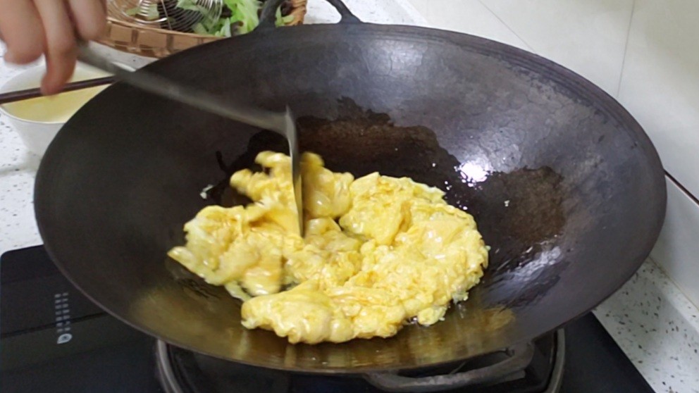 第五、用蛋液炒鸡蛋。在热油锅里倒入鸡蛋液,翻炒至8成熟时用锅铲分成小块起锅装盘。