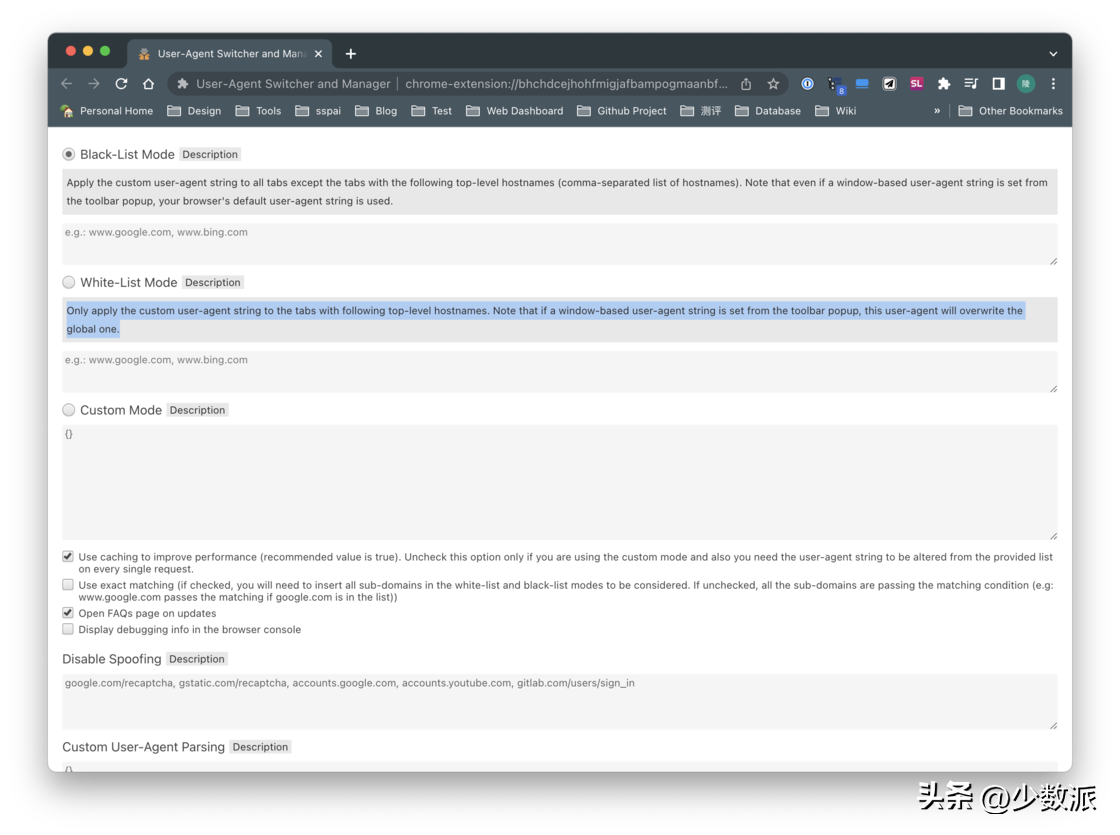 如果你担心修改全局 UA 会破坏网页渲染的话,User-Agent Switcher and Manager 的设置中还提供了「White-List Mode(白名单模式)」,把 bilibili.com 添加到下面的框中,在点击屏幕最下方的的「save」按钮即可只对 Bilibili 使用这个特殊的 UA。