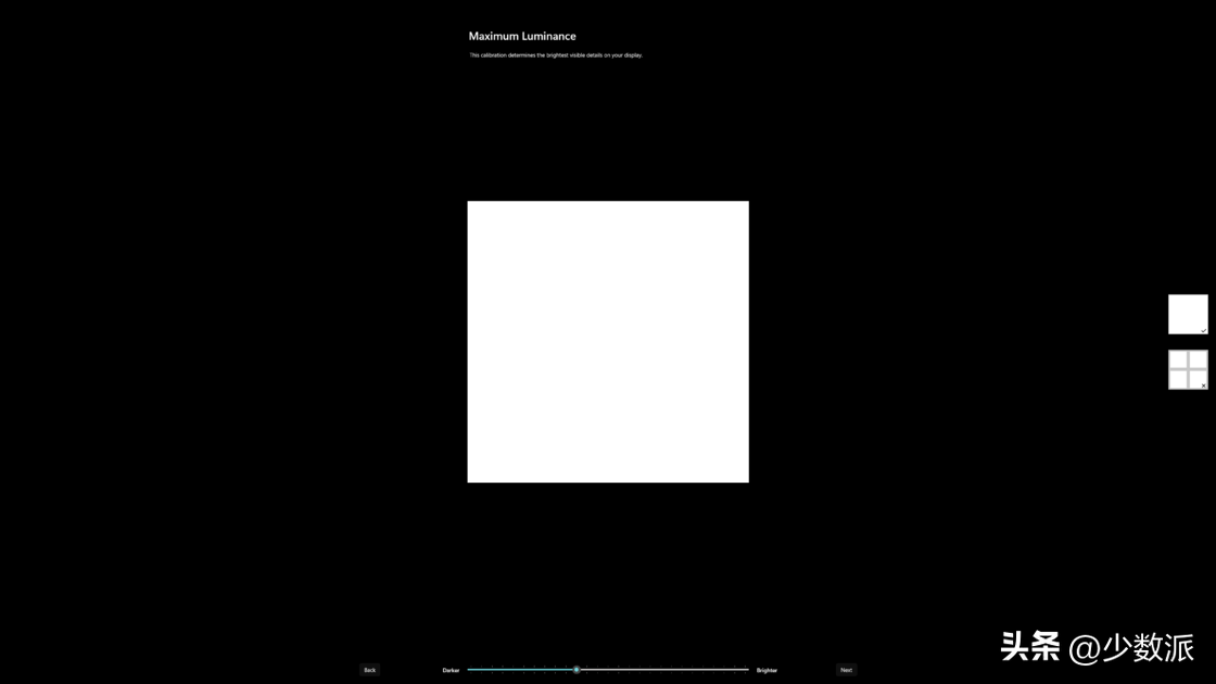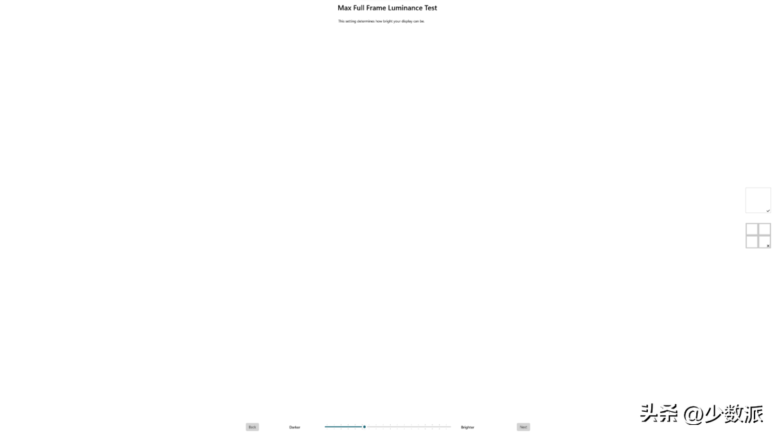 接下来是「矫正全屏最大亮度」,在 HDR 世界中全屏的显示高亮画面的场景也不少,包括:阳光充足的户外、整体亮度较高的室内抑或是炫酷的画面特效,这时画面整体的亮度较高,高亮度区域会占据整个画面 80% 以上或是 50% 以上画面长期处于高亮度的环境中。这种情况下收到散热、材质或是其他因素的影响,背光或者 OLED 本身无法长期保持最高的亮度,通常会下降到另一个名叫全屏亮度的等级上。而「矫正全屏最大亮度」有助于 Windows 能够锚定显示 HDR 内容时全屏的最大亮度,调整时需要让中间的「灰色」十字和周围的「白色」区域一样亮。不过,这里也可能会遇到上面类似的问题——「滑杆拉到最右边才行」,这里同样建议根据厂商宣传中的全屏最大亮度的参数调节滑杆到正确的数字上。
