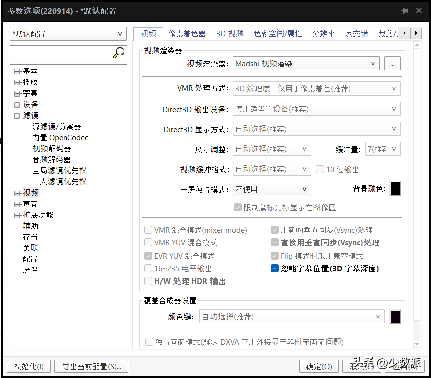 最后,也是最重要的一个环节设置和 madVR 的相关设置。同样在播放窗口邮件-「滤镜」-「Madshi Video Renderer」,打开 madVR 的相关设置。
