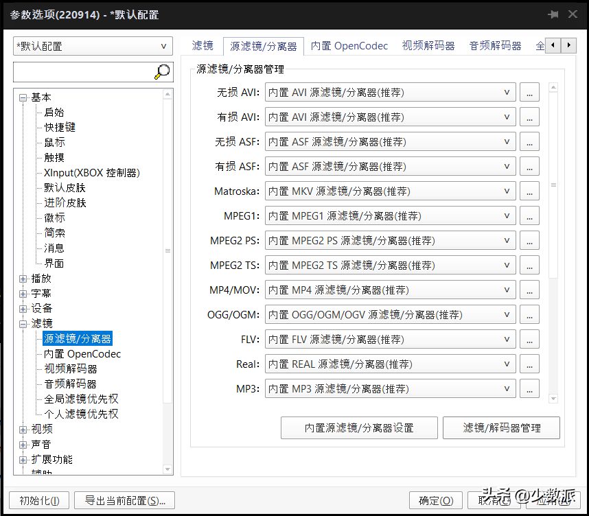 接下来切换到「源滤镜/分离器」,点击右下角的「滤镜/解码器管理」-「搜索后添加」,勾选所有的 LavFilter 滤镜以后点击确认,稍后在「源滤镜/分离器」中为每个格式都切换为「LAV Splitter Source」分离器。