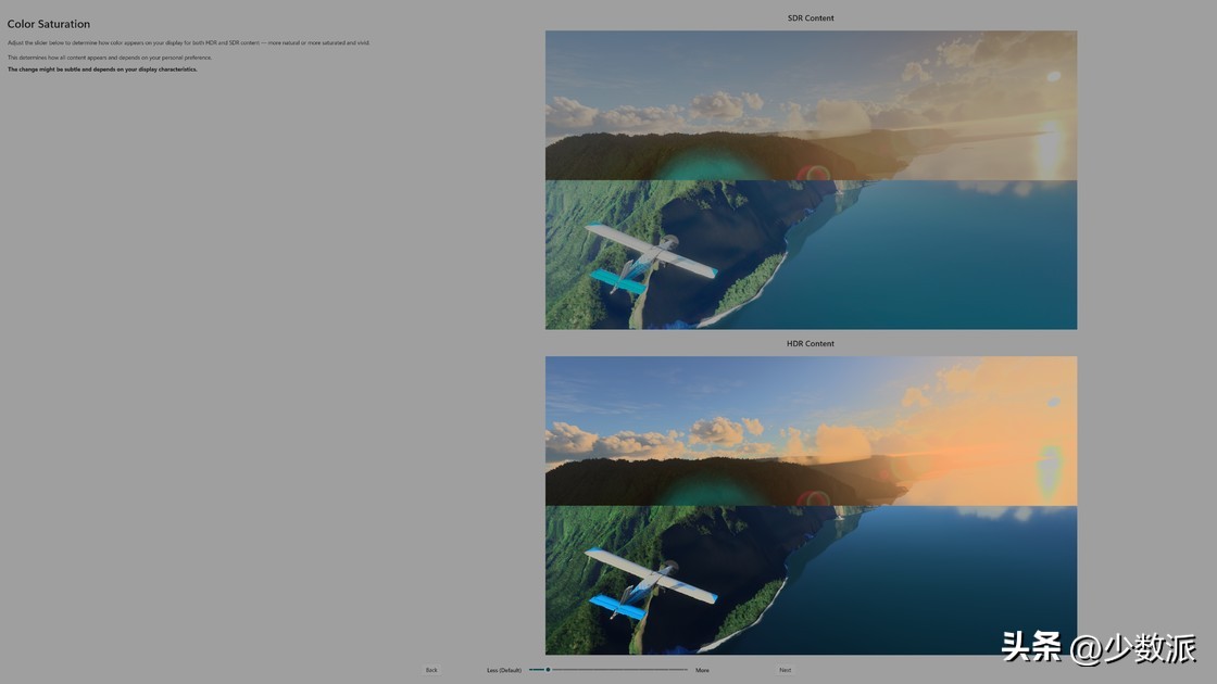 最后,就是「给屏幕颜色加点料」了,这一步中的滑杆就是调整画面饱和度用的,如果你在开启 HDR 以后希望画面色彩可以更鲜艳一点,那么就可以适当往右调节一点滑杆,如果你希望颜色更准确一些,那么保持在最左侧即可。