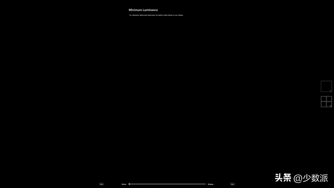 首先是「矫正最暗亮度」,在这一步中主要是需要将屏幕调整到最低所支持的亮度,由于大家的屏幕不是支持分区背光就是 OLED 显示器,那么这里直接拉到 0 就可以了;因为无论是关闭的背光还是现实黑色的 OLED 本身几乎不发光,因此就可以设置为 0 nit。