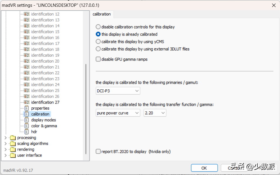 接下来跳转到 「Calibration(校色)」中,如果你的显示器以及校准过颜色,那么就可以选择「this display is already calibrated(这个显示器已经经过校准)」,并在下方的更多信息中设定好正确的信息。比如,我的显示器支持 95% 的 Display P3 色域,在这里我就选择了 DCI-P3,下面的 Gamma 函数则是基于「pure power curve」的「2.20」。如果你的显示器还没有校准过颜色,那么可以考虑「disable calibration controls for this display(在这个显示器上禁用校准控制)」;如果你对校准有更进一步需求的话,那么我建议你使用「calibrate this display by using external 3DLUT files(使用外部 3D LUT 文件校准这个显示器)」,而生成 3D LUT 文件的方式有很多,其中一个就是借助 DisplayCAL 在校色以后生成一个。