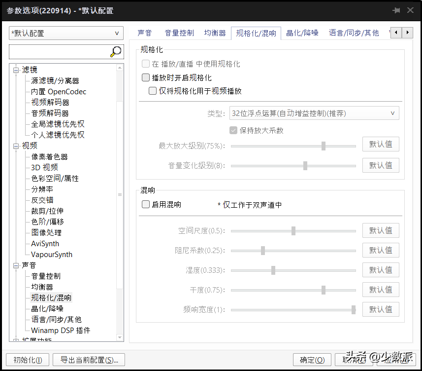 紧接着我们需要切换到「视频」面板,将「视频渲染方式」改为「Madshi 视频渲染」。并将位于「声音」-「规格化/混响」下的「播放时开启规格化」给关闭。