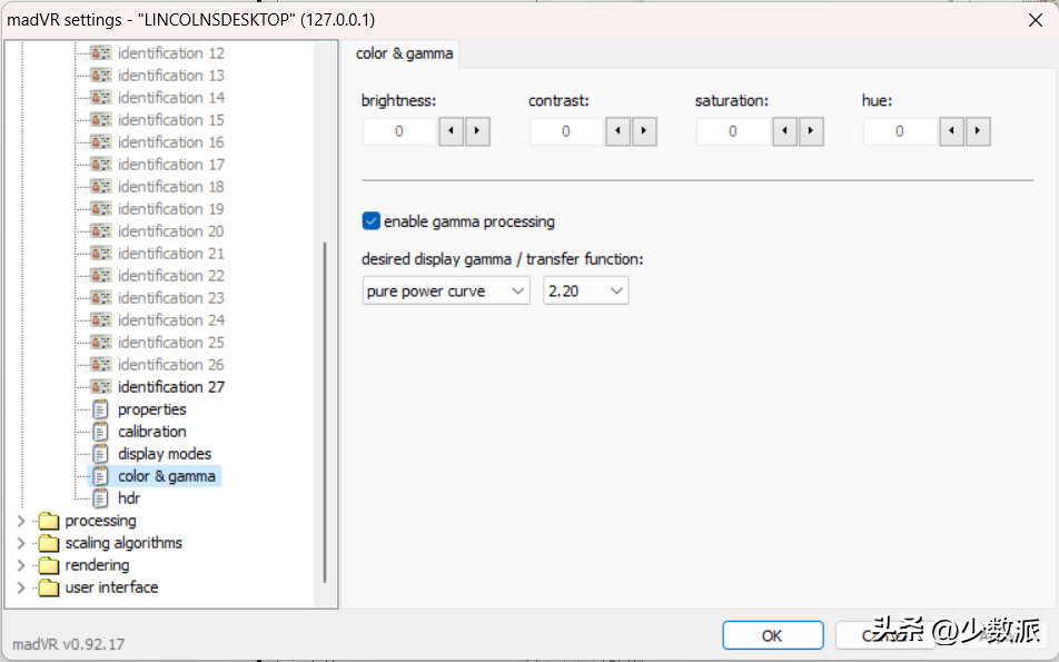 紧接着,还需要在「color & gamma(颜色和伽马)」中勾选「enable gramma processing(启用伽马处理)」并设置为「pure power curve」和「2.2」。如果不进行这一步,HDR 内容的画面将始终是灰蒙蒙的。
