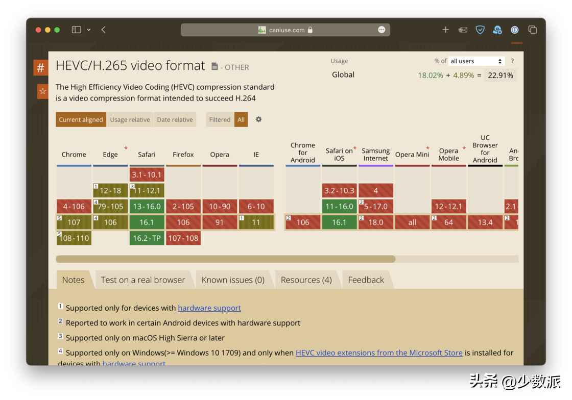 不过事实并不是如此,在翻阅 caius.com 中 HEVC/H.265 有关的内容时,我注意到 Edge 即使是更换了到 Chromium 以后也是支持 HEVC/H.265 解码的,而 Chrome 在最近发布的 107 版本中也正式支持了 HEVC/H.265 相关内容的解码。