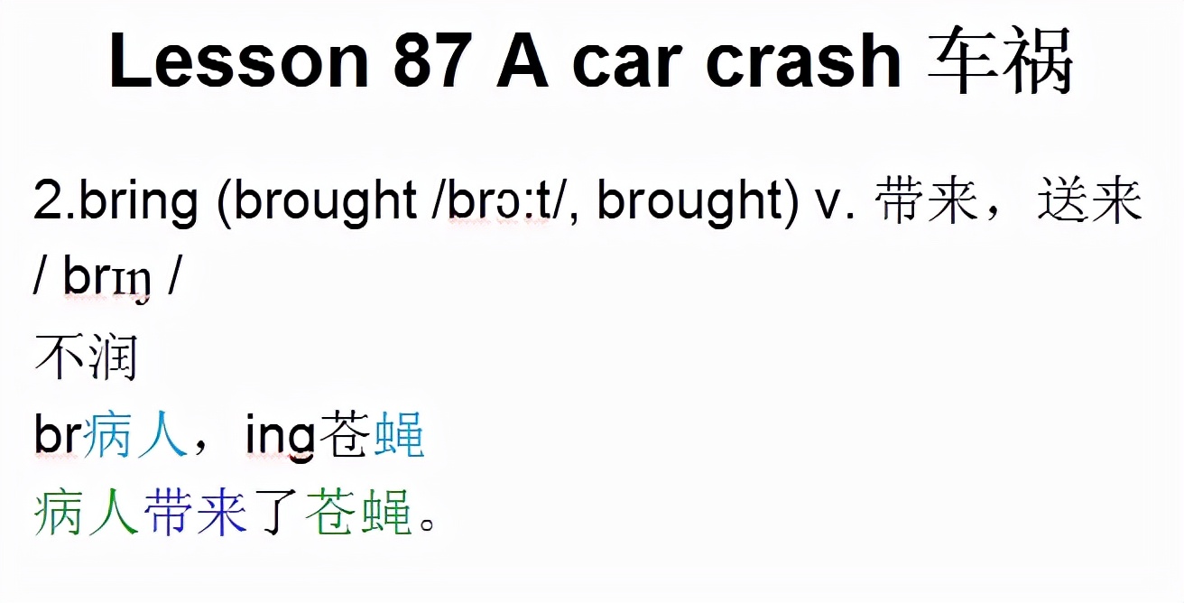 2.bring (brought /br?:t/, brought) v. 带来,送来