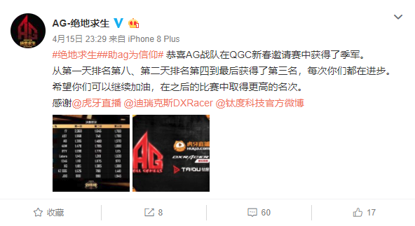 恭喜AG战队在QGC新春邀请赛中获得了季军。
