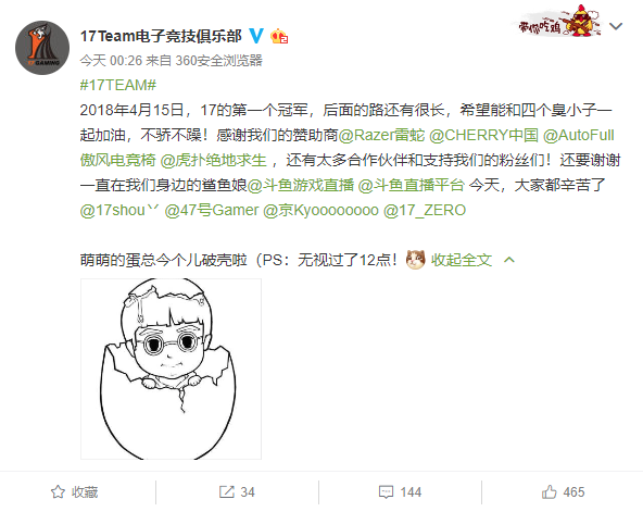 2018年4月15日,17的第一个冠军,后面的路还有很长,希望能和四个臭小子一起加油,不骄不躁!
