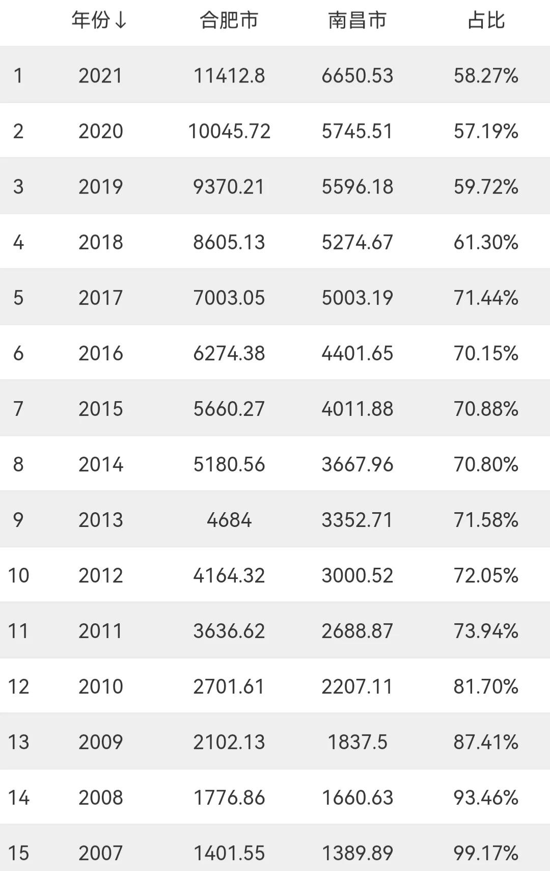 你或许不曾想到的是,在2006年之前,南昌的GDP总量一直是强于合肥的,2007年开始,南昌开始落后于合肥,并迅速扩大差距。到了2020年南昌的体量仅有合肥的57.19%。在过去的2021年或许就是南昌崛起的一年,与合肥的对比来看,这是其15年来,第一次缩小与合肥的差距,占比从2020年的57.19%,升至58.27%。