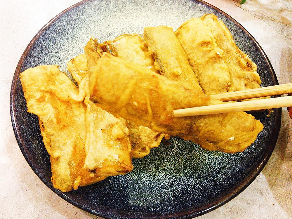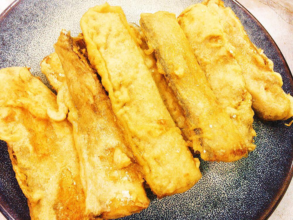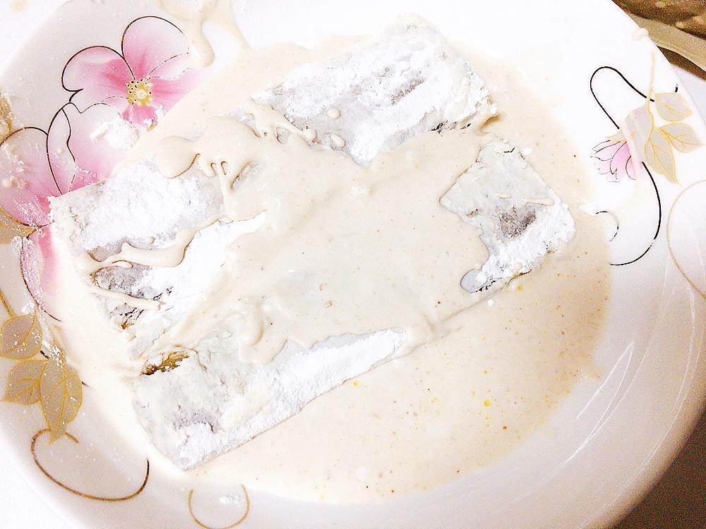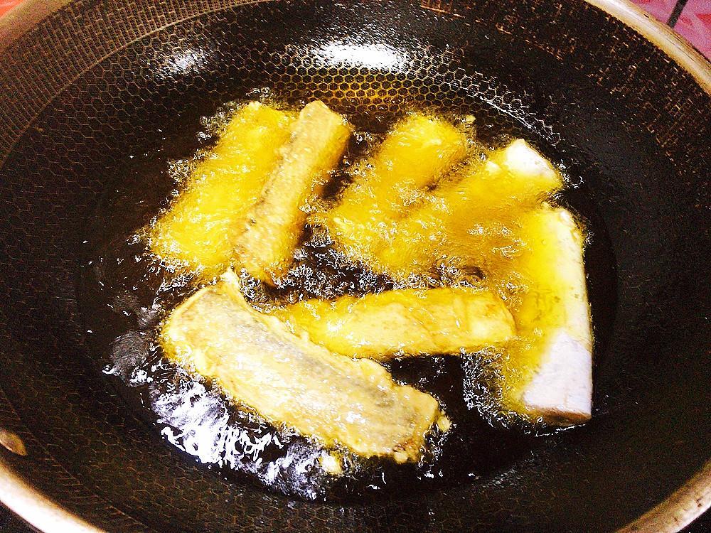 将腌制好的带鱼段一个个地放入粉浆中,均匀地裹上好粉浆;锅中倒入足量的植物油,大火将油加热到放入筷子冒小气泡时,将裹好粉浆的带鱼段放入锅中,中火慢炸,最后再用大火炸到两面金黄,捞出来用吸油纸吸干净余油,就可以美美地享用了。