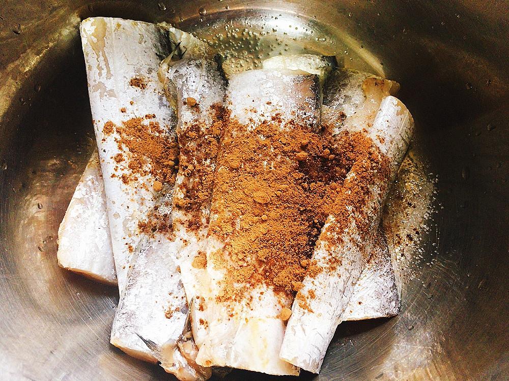 将买回来的带鱼段清理干净里面的内脏以及黑色的污渍,冲洗干净后撒上少许盐、料酒、十三香,腌制10分钟;带鱼属于深海鱼类,本身自带咸味,腌制时盐要少放,以免过咸;