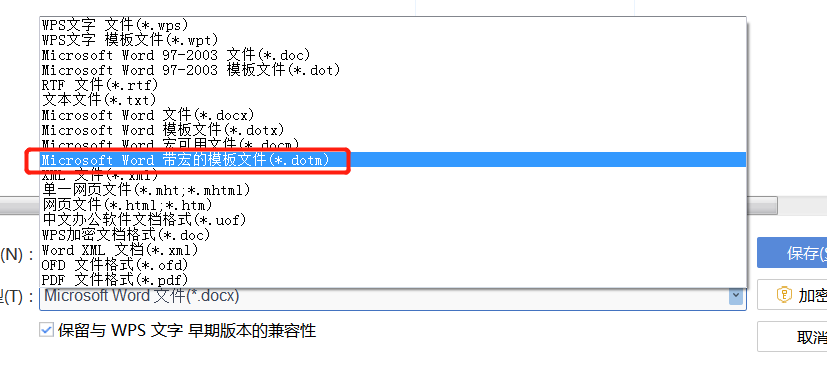 步骤1:通过设置好所有格式的模板新建文档(即通过之前文章《如何实现快速修改公文格式》所描述的,新建——从模板中创建,创建新的文档)——另存为——其他格式,在文件类型里面选择“带宏的模板文件(.dotm)”项,文件名随便命名(比如“123.dotm”)——保存。