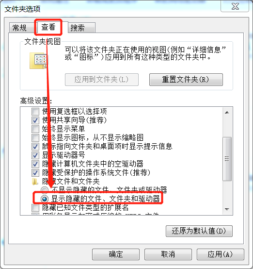 (1)计算机上的组织——文件夹和搜索选项——查看——选中显示隐藏的文件、文件夹和驱动器,隐藏的文件就显示出来了,就可以一步一步找到。