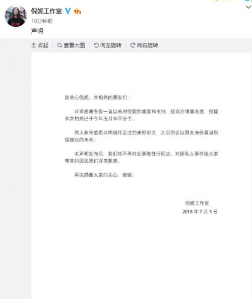 5日,井柏然工作室与倪妮工作室在微博发布声明,宣布井柏然与倪妮于五月已经和平分手。据悉,2016年3月,倪妮和井柏然恋情爆光,双方经纪人承认恋情。