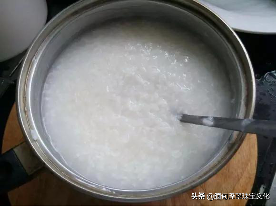 细糯种:这里提到的“细”指的就是翡翠晶体颗粒的质地非常的细密,这个种份特征更多的是倾向于肉质细腻程度而不是透明度,它是相比于纯糯种给人的感觉更加细腻,最直观的就是晶体颗粒没有那么明显。就像下图咱家老太太煮的大米稀粥(饭)一样 。