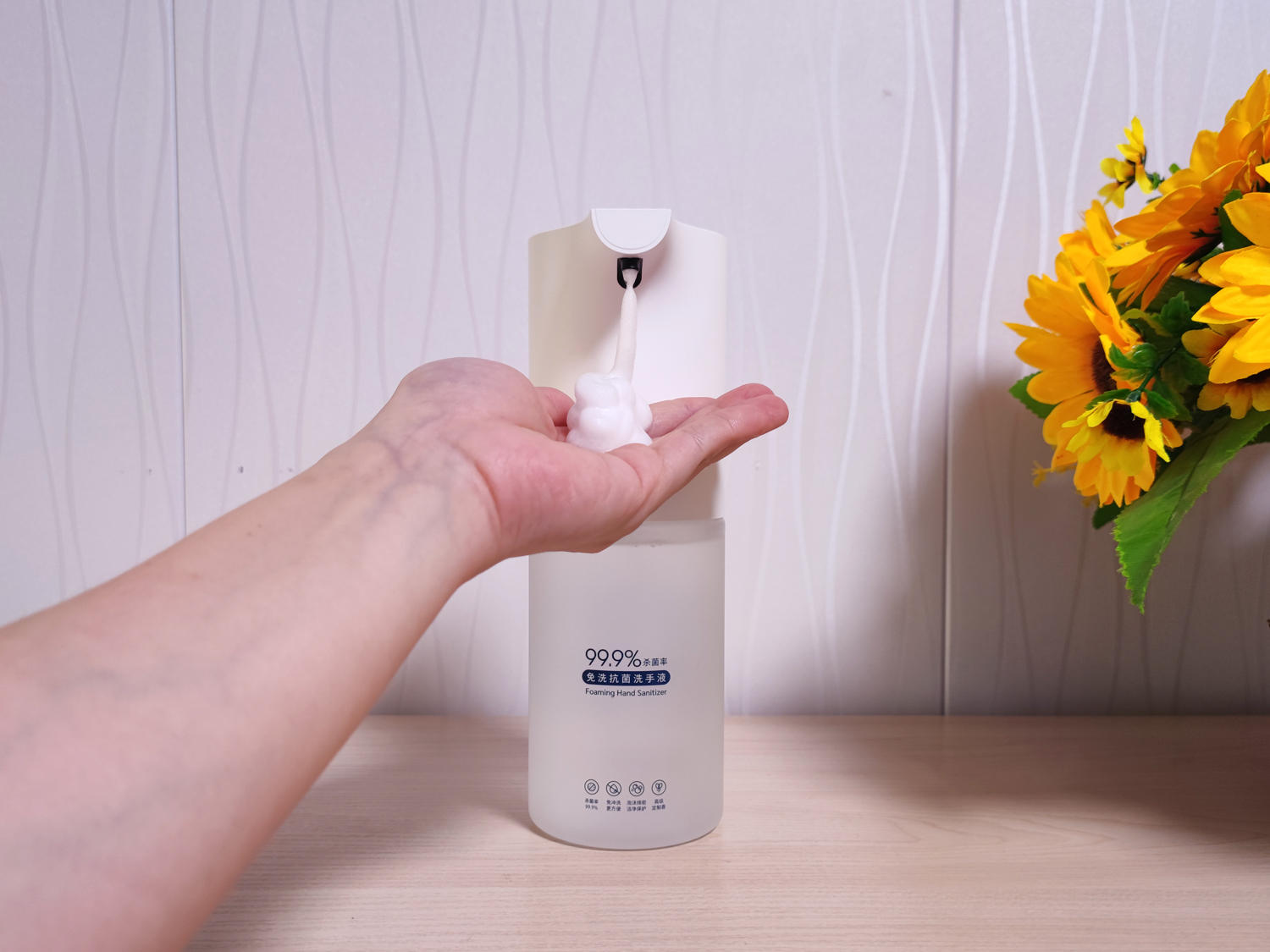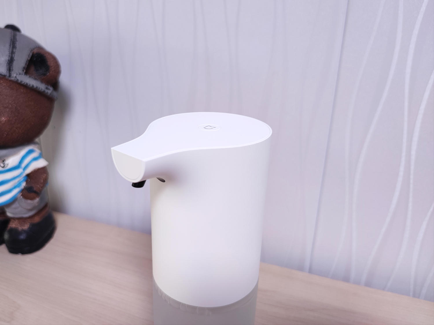 洗手机顶部是开关键与指示灯、出泡口下方是感应区域;轻触开关键会自动开机,指示灯亮蓝色,此时伸手至感应区即可获取泡沫。我之所以选择米家自动免洗洗手机,就是看中它采用红外感应,只需0.25s快速感应出泡,伸手即可获取泡沫,无明显的停顿感;而且每次泡沫都是恰到好处,刚好够洗一次手。 红外感应加持,不仅取泡沫速度快,而且不用压、免接触,多人共用时减少交叉感染,更安全卫生。