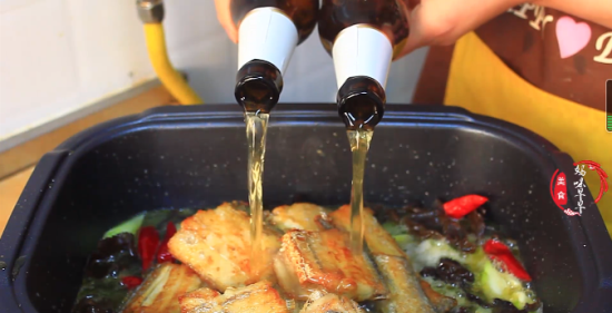 第四步,锅里留油,然后下入葱姜蒜,干红辣椒炒出香味,接着再倒入木耳翻炒几下,炒均匀后倒入带鱼,加入啤酒,啤酒没过带鱼即可,然后加入生抽,酱油,香醋,盐,胡椒粉,几颗冰糖,然后轻轻的将调料搅拌均匀,不要用力搅拌,防止鱼肉散开,盖上盖子煮到带鱼完全入味。