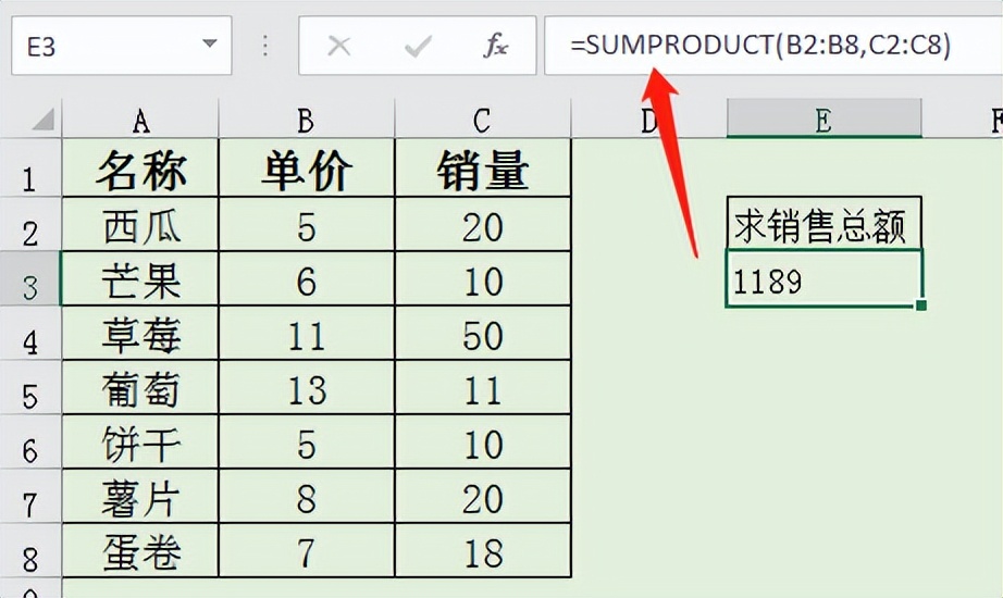 如下图,我们已知每一个产品的单价和销量,怎样快速计算所有产品的销售总额呢?