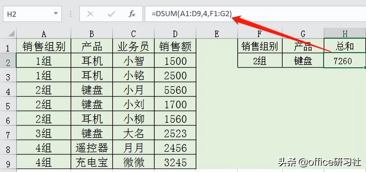 如下图所示,我们需要数据表里面销售组别为2组,产品为键盘的销售总和