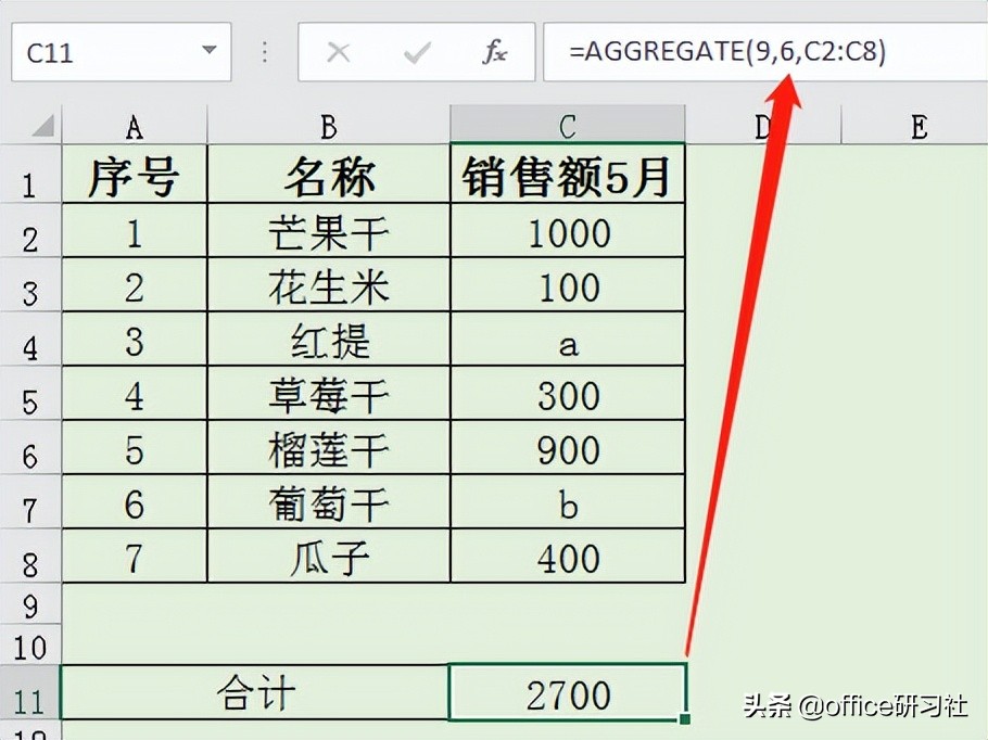 公式AGGREGATE(9,6,B2:B8)里面第一参数9代表函数SUM;
