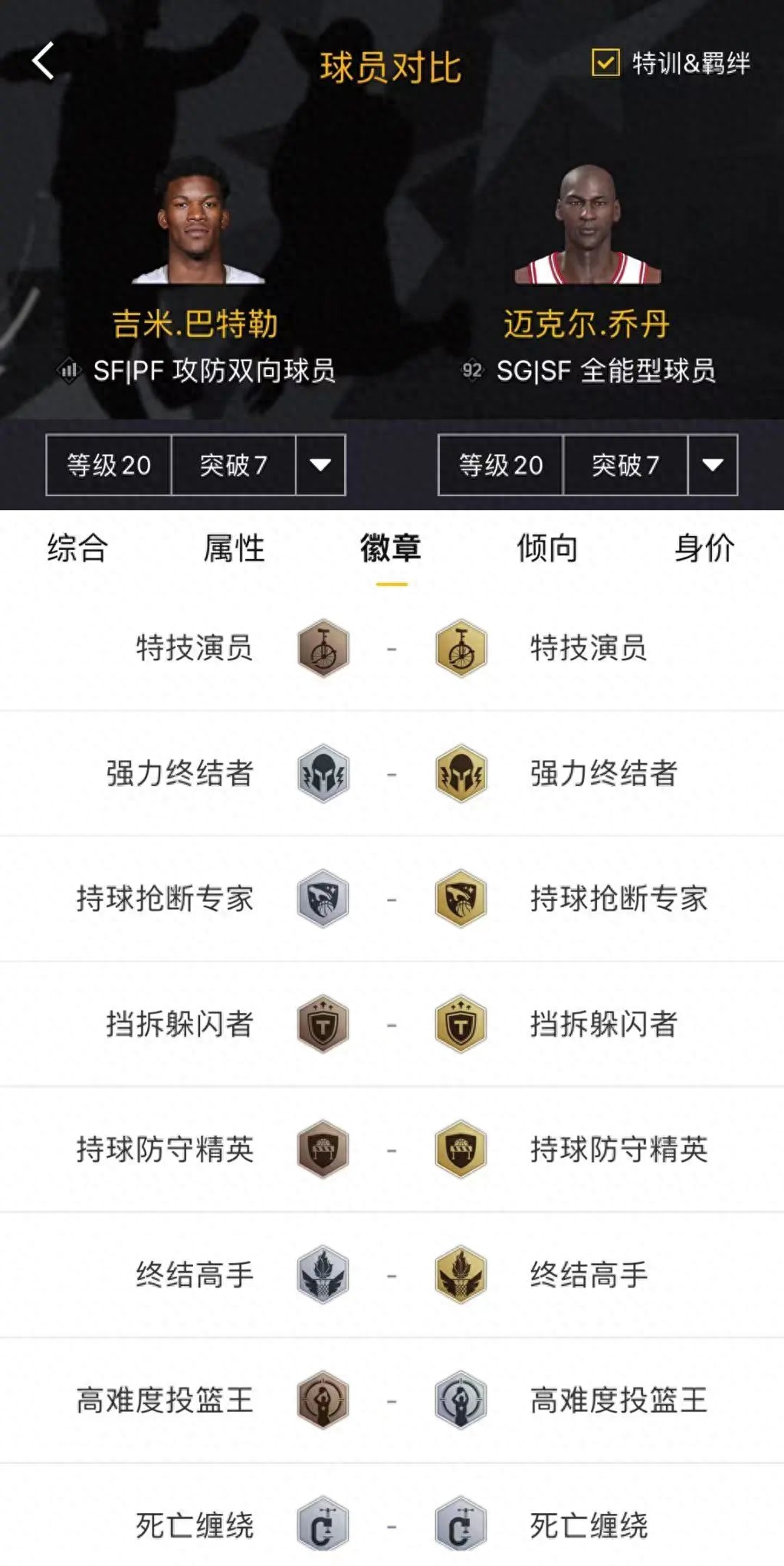 最亮眼的就是巴特勒的防守,防守徽章大部分都是银色,且数值非常到位,外防高达115,还能当D狗,运球抢断115,传球抢断更是高达126,且速度和模板都是有的,更何况,巴特勒超级硬