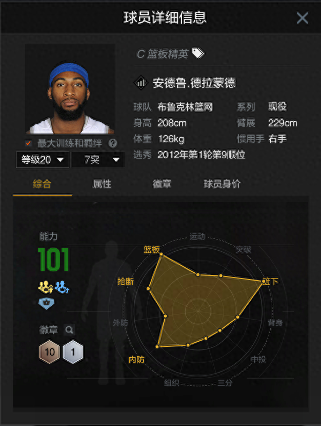 进攻就是扣或者强起,抛开进攻,他的篮板数值绝对属于顶级,进攻篮板121,防守篮板高达128,还有篮板徽章的加持,虽然模板不是很高,但是很宽